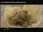 Nel cestino realizzato con Su Casizolu -formaggio da latte vaccino tipico del Montiferru, una vasta area geografica a nord di Oristano, in Sardegna - viene adagiata la fregola sarda preparata con guanciale, cipolle e zucchine.